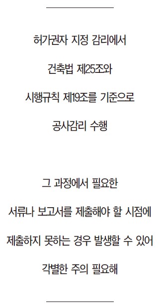 허가권자 지정 건축공사 감리에서 건축사들은 주로 건축법 제25조(건축물의 공사감리)와 시행규칙 제19조(감리보고서 등)를 기준으로 공사감리를 수행한다. 그 과정에서 필요한 서류나 보고서를 제출해야 할 시점에 제출하지 못하는 경우가 발생할 수 있으므로, 이에 각별한 주의가 필요하다.