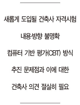 2027년부터 시행된다고 하는 새로운 건축사 자격시험은 아직도 방향과 내용이 알려지지 않고 있다. 특히, 직접적으로 영향을 받는 건축사들에게 자세히 설명되거나 토론된 적이 없다. 공청회나 건축학회의 연구만 진행된 상태이며, 국토교통부의 진행 방식과 건축사들과의 긴밀한 협의나 구체적인 방향 설정도 아직 이루어지지 않았다. 이런 상황에서 2027년 건축사 자격시험의 평가 방식을 객관화한다는 명분으로 컴퓨터 기반 평가(CBT) 방식을 추진하는 국토교통부의 방침이 우려스럽다.