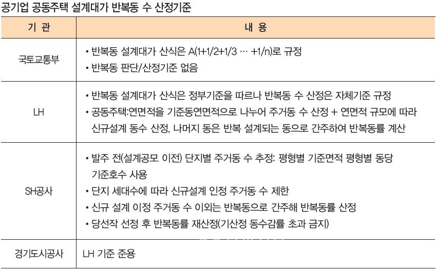 LH와 함께 대표적 공기업인 SH공사의 반복동 산정기준은 더 심각하다. SH는 설계자가 공모안을 ‘가상적 설계내용’대로 조정하지 않을 수 없는 상황을 조성하고 있다. 실제 설계안의 주거동 수가 ‘가상적 설계 내용’에 비해 적은 경우 주거동 면적 증가는 고려하지 않고 줄어든 주거동 수만을 고려해 반족동률을 재산정하고 있다. 이는 반복동률은 작아지고 설계비 역시 줄어드는 효과로 이어진다.
