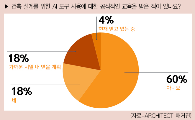 미국 건축 분야의 AI 현황에 대한 최근 설문 조사에 따르면 응답자의 60%가 AI를 설계 워크플로우에 활용하고 있으며, 이는 정식 교육 없이 이루어지는 경우가 많은 것으로 나타났다. AI 도구의 채택에는 더 많은 교육 리소스와 테스트, 구현·통합에 대한 시간이 필요하다는 과제가 있다.