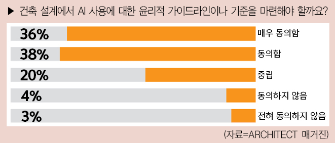 AI 채택이 보편화됨에 따라 고용 안정성에 대한 우려가 제기되고 있으며, 윤리적 지침의 필요성이 강조되고 있다. 설문조사 응답자의 74%는 AI 사용을 규제하고 지적 재산, 품질 보증, 투명성을 다루는 지침이 필요하다고 응답했다. 이는 AI 기술이 인력을 대체하지 않고도 건축 분야에서 활용될 수 있도록 하는 것이다.