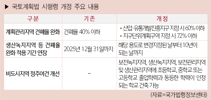 개정 시행령에 따르면, 계획관리지역 내 공장이 체계적이고 계획적으로 입지할 수 있도록 건폐율 완화 범위가 확대된다. 기존의 건폐율 ‘40퍼센트 이하’에서 계획관리지역에 산업·유통개발진흥지구가 지정된 경우 ‘60퍼센트 이하’, 지구단위계획구역이 지정된 경우 ‘72퍼센트 이하’로 각각 상향 조정된다.