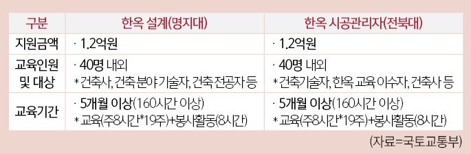 이번 교육은 한옥 설계와 시공관리자 두 가지 과정으로 구성되며, 명지대와 전북대가 7월부터 교육과정을 운영한다. 한옥 설계 과정은 정규 학교 교육이나 기존 한옥 교육만으로는 부족했던 한옥 설계 전문인력을 양성하고 졸업작품전도 개최한다. 한옥 시공관리자 과정은 전통 건축인 한옥에 대한 높은 관심에 부응해 공정관리, 물량 산출 등 현장 전반을 관리할 역량을 강화한다.