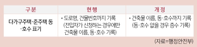 이번 개정령안에 따르면, 3층 이하, 바닥면적 합계 660㎡ 이하, 19세대 이하의 다가구주택과 기숙사, 다중생활시설, 노인복지주택, 오피스텔 등 준주택을 포함해 전입신고 시 건축물의 이름, 동 번호, 호수 또는 층수를 기록해야 한다. 이러한 정보는 주민등록표 등·초본에는 표기되지 않지만, 전산자료 형태로 관리돼 복지위기가구 발굴, 우편물 발송, 건강보험 관리 등의 목적으로 활용될 예정이다.