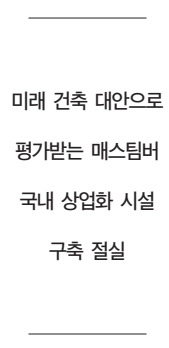 세계적으로 매스팀버는 미래 지향적인 건축 대안이 되면서 기존 건축물의 대체재로 사용되고 있다. 매스팀버는 여러 층의 작고 얇은 판재를 겹겹이 접합하여 적층한 목재로 대형의 기둥, 보, 바닥 및 벽체 패널로 대형 구조 요소를 건축 구조재로 사용하는 건축시스템이다. 건축에 적합하도록 강도와 안정성을 보강 설계한 제품이라 할 수 있다. 그러니까 콘크리트 및 강철과 같은 재료에 대한 강력한 내구성과 친환경적 대안이 되면서 설계자의 의도대로 제작되고 있다.