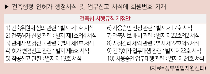 개정 시행규칙에 따르면, 시행규칙 ▲【별지 제1호 서식】 건축위원회(심의, 재심의) 신청서 포함 총 10종에 건축사협회 회원번호를 기재해야 한다. ▲【별지 제1호의4 서식】 건축·대수선·용도변경 (변경)허가 신청서 ▲【별지 제4호 서식】건축관계자 변경신고서 ▲【별지 제6호 서식】건축·대수선·용도변경 (변경) 신고서 ▲【별지 제13호 서식】착공신고서 ▲【별지 제17호 서식】(임시)사용승인 신청서 ▲【별지 제22호의2 서식】건축공사 건축사보 배치 현황 제출 ▲【별지 제22호의5 서식】허가권자가 지정하는 감리대상 건축물 제외 신청서 ▲【별지 제23호 서식】건축허가조사 및 검사조서 ▲【별지 제24호 서식】사용승인조사 및 검사조서가 이에 해당한다.