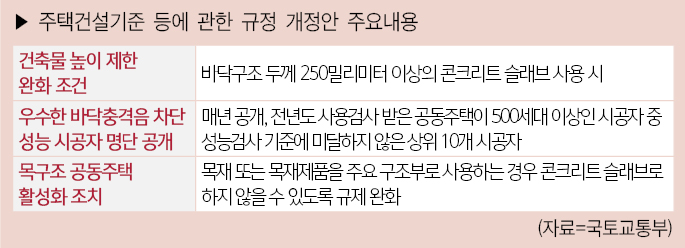 개정안에 따르면 건축물 높이 제한을 완화할 수 있는 바닥구조 두께는 콘크리트 슬래브 두께 250밀리미터 이상으로 정해졌다. 또한 바닥충격음 성능검사기관은 전년도에 사용검사를 받은 공동주택이 500세대 이상인 시공자 중, 성능검사 기준에 미달하는 주택단지가 없는 시공자들을 대상으로 평균 성능검사 결과 상위 10개 시공자를 선정해 해당 기관의 인터넷 누리집에 공개하도록 의무화했다.