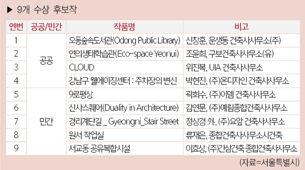 8명의 심사위원들이 서류심사, 현장 심사를 통해 9개의 수상 후보작을 선정했으며, 발표회에는 이렇게 선정된 건축사가 설계의도 구현 과정과 사용자의 경험을 시민들과 함께 공유할 예정이다.