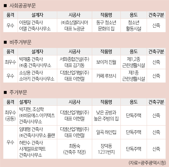 우수작으로는 공공부문에서 ‘동구 청소년 문화의집(이원일 건축사, 이엘 건축사사무소)', 비주거부문에서 ‘카페 루브시(소상용 건축사, 소아키 건축사사무소)', 주거부문에서 ‘일곡 하얀집(임태형 건축사, 주.건축사사무소 플랜)'과 ‘장덕동 1231(허만수 건축사, 사계절프로젝트 건축사사무소)'이 선정됐다. 특히 ‘동구 청소년 문화의집'은 주민들에게 친근한 공간감을 제공하며 주변 환경과 조화를 이루는 점에서 높은 평가를 받았다.