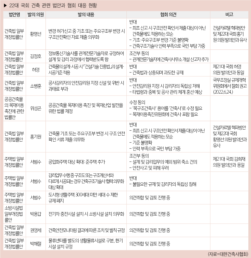 22대 국회가 개원한 지 세 달 만에 건축 관련 법안들이 대거 발의되면서 대한건축사협회가 이에 적극 대응하고 있다. 협회는 각 법안이 건축사의 업무에 미치는 영향을 면밀히 검토, 문제점을 지적하며 적극 대응 중이다.