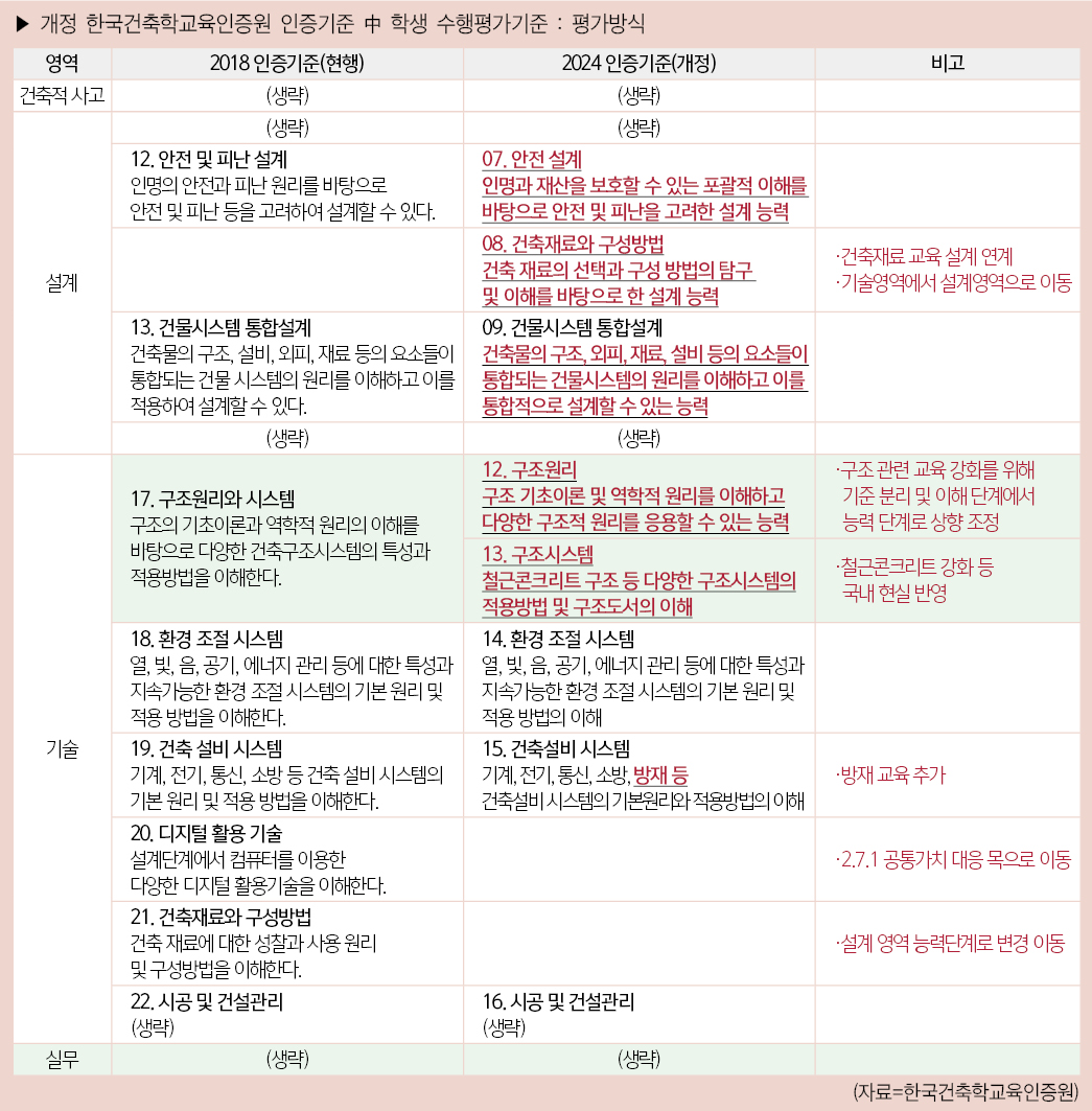 인증원에 따르면, 기존의 2018년 인증기준에서는 26개의 학생 수행평가 기준 중 구조 교육이 단 하나의 기준으로 포함됐지만, 2024년 개정안에서는 22개의 기준 중 두 개로 확대됐다. 이로 인해 구조 교육의 중요성이 크게 부각됐다. 구체적으로, 개정된 인증기준은 구조 기초이론과 역학적 원리를 이해하는 능력을 강화하고, 이를 실제 건축설계와 시공에 응용할 수 있도록 반영하고 있다. 학생들이 구조적 원리를 이해하는 데 그치지 않고, 다양한 구조 시스템을 직접 적용할 수 있는 능력을 갖추도록 한다는 취지다.