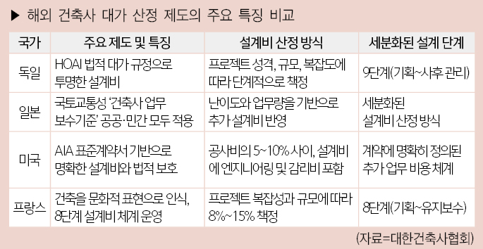 한 공공기관 건축 담당자는 “독일과 프랑스 등 건축문화 선진국들은 세분화된 설계 업무 단계를 통해 설계비 산정의 투명성과 합리성을 보장하고 있다”며 “우리나라도 설계 업무를 더욱 구체적으로 세분화하고, 합리적인 대가 기준을 마련하며, 설계 변경에 대한 명확한 보상 체계 등 건축사의 공정한 대가를 보장하는 체계를 구축할 필요가 있다”고 강조했다.