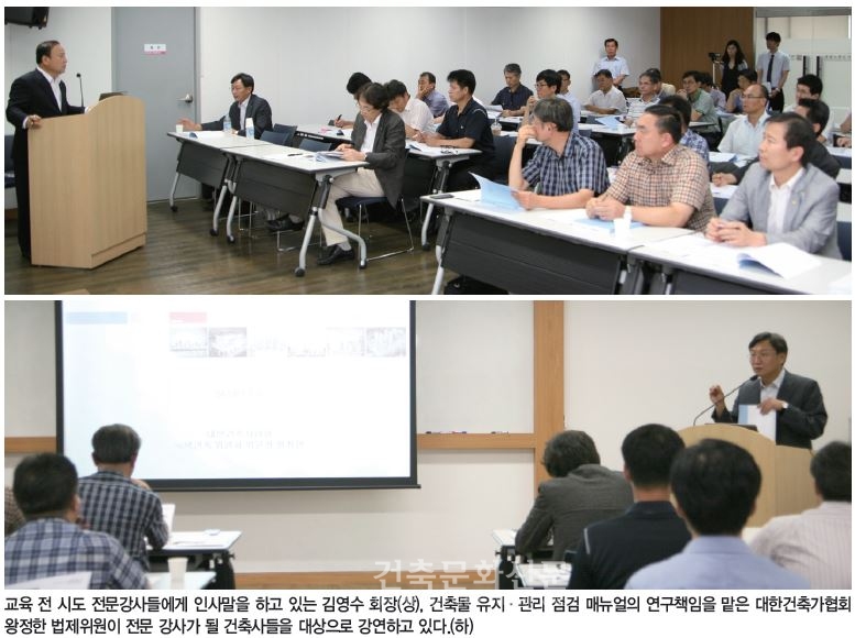 대한건축사협회는 지난 7월 25일 오후1시 건축사회관 2층 교육장에서 시도건축사회 전문 강사로 추천받은 건축사 40여명이 참석한 가운데 ‘건축물 유지․관리 점검 시도 전문 강사 교육’을 실시했다. 이날 행사는 곧 시행될 건축물 유지․관리 점검과 관련해 각 시도별로 교육을 이끌 전문 강사의 사전교육을 위해 마련됐다.