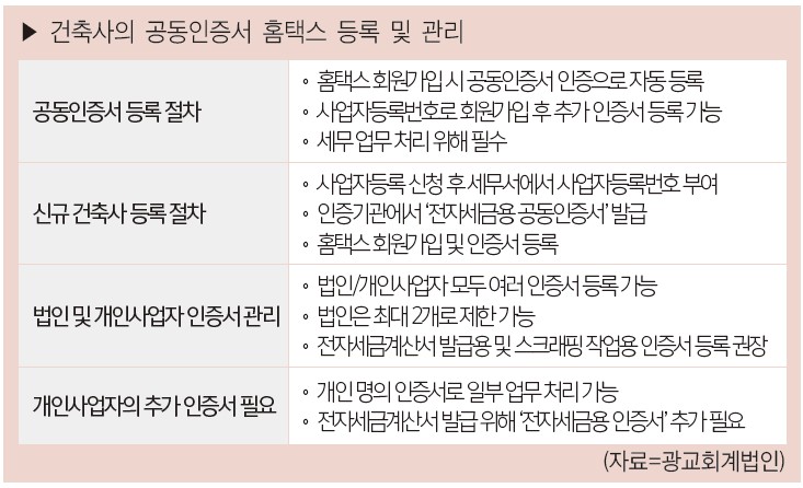 다시 정리하자면, ① 신규 건축사분들이 사업자(법인 또는 개인) 등록 신청을 진행해 관할 세무서에서 고유한 ‘사업자등록번호’를 부여받은 후, ② 각종 인증기관에서 ‘전자세금용(기업범용 또는 세무서 보안카드) 공동인증서’를 발급받으신 다음, ③ 홈택스 회원가입을 하고, 발급받은 인증서를 고유 사업자등록번호와 연동해 홈택스에 등록하셔야 합니다.