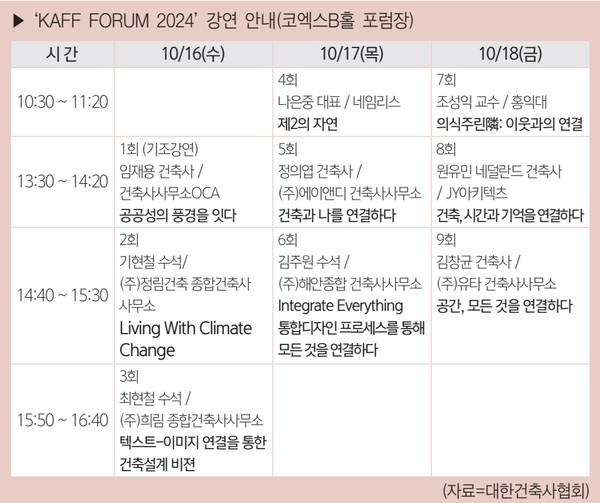 포럼은 건축사를 비롯해 일반인 참관객에게 건축과 한국건축산업대전, 그리고 대한건축사협회를 홍보하고, 나아가 대한민국 건축문화의 발전을 위해 기획됐다. 때문에 포럼은 전시회 관람객들의 동선을 고려해 특별히 마련된 코엑스 1층 B홀 KAFF 포럼장에서 진행된다.