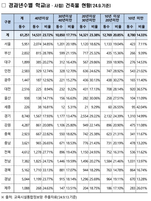 진선미 의원실, ‘시도교육청 경과 연수별 학교 건축물 현황’ 분석