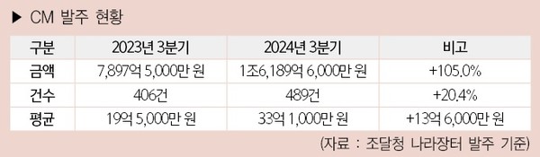 2024년 3분기 공공공사 CM용역 발주금액이 1조 6,189억 6,000만 원으로 전년 동기 대비 105% 증가한 것으로 집계됐다. 발주건수는 489건을 전년 406건보다 20.4% 증가했으며, 1건당 평균 발주금액은 33.1억 원으로 전년 19억 5,000만 원보다 13억 6,000만 원 증가한 것으로 나타났다.