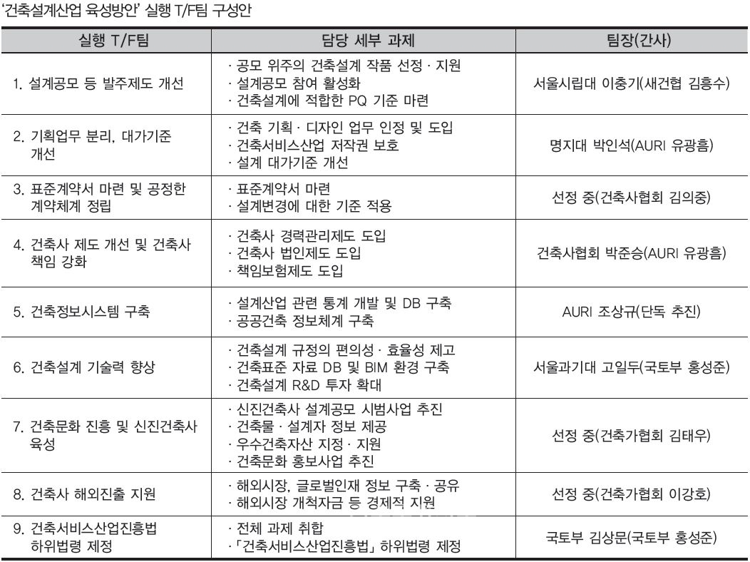 국토부는 건축설계산업 육성을 위해 산·학·연·관 인사들로 구성된 총 9개의 실행 T/F팀을 구성했다. T/F팀은 국토부, 국건위, 건축도시공간연구소(AURI) 및 민간전문가(학계, 업계, 연구원), 관련단체(대한건축사협회, 한국건축가협회, 새건축사협의회) 등이 고루 참여하고 있으며, 운영 과정에서는 일반 국민들의 의견 또한 청취할 계획이다. 특히 많은 과제를 한꺼번에 다룸으로써 역량이 분산되지 않도록 개별 T/F팀들은 주어진 과제 해결에만 집중, 10월까지 가시적인 성과가 나올 것으로 예상된다.