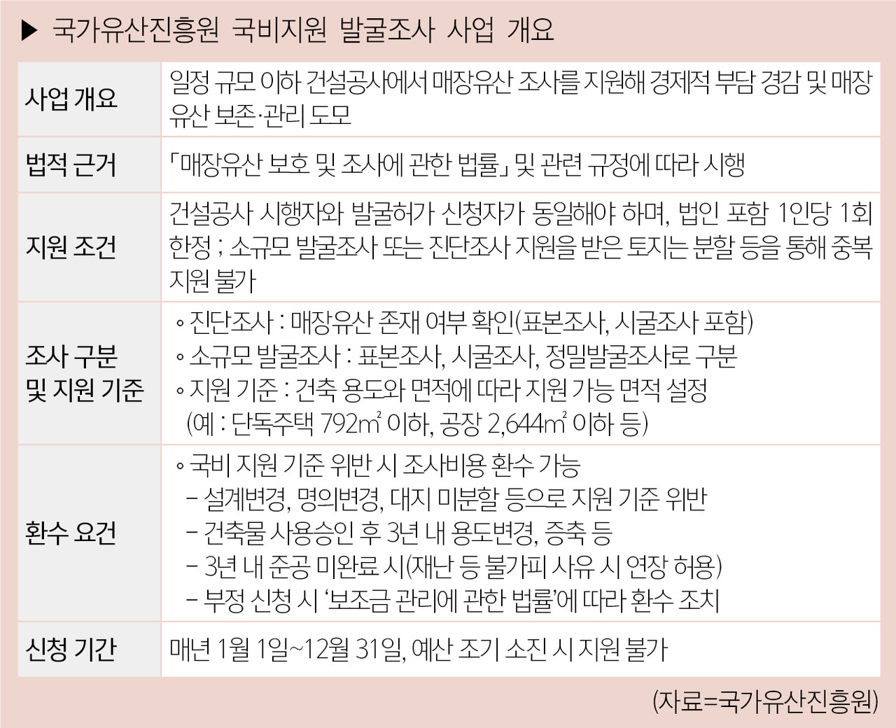 국가유산진흥원 관계자는 “매장유산 보존과 건설공사 시행자의 부담 경감을 위해 국비지원 발굴조사 사업을 시행하고 있다”며 “특히 소규모 건설공사에서 발생할 수 있는 매장유산 훼손을 최소화하면서도, 효율적인 지원 방안을 마련해 건축 시행자들이 보다 안정적으로 사업을 추진할 수 있도록 하고자 하며, 또한, 지원이 공정하게 이뤄지도록 지원 조건과 환수 요건을 명확히 해 사업의 신뢰도를 높이는 데 중점을 두고 있다"고 전했다.