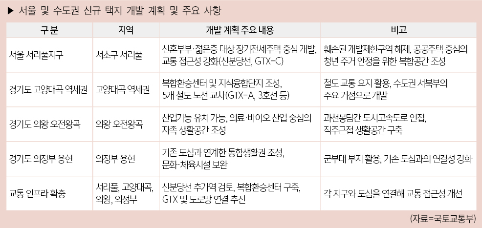 국토교통부는 5일 서울과 수도권에 신규 택지 5만 호를 공급하는 계획을 발표했다. 이는 ‘주택공급 활성화 방안(8.8)’의 후속조치로, 서울 서리풀지구와 경기도의 고양대곡, 의왕 오전왕곡, 의정부 용현 등 4개 지구에서 개발제한구역을 해제해 주거 및 일자리 공간을 조성하는 내용이 포함됐다.