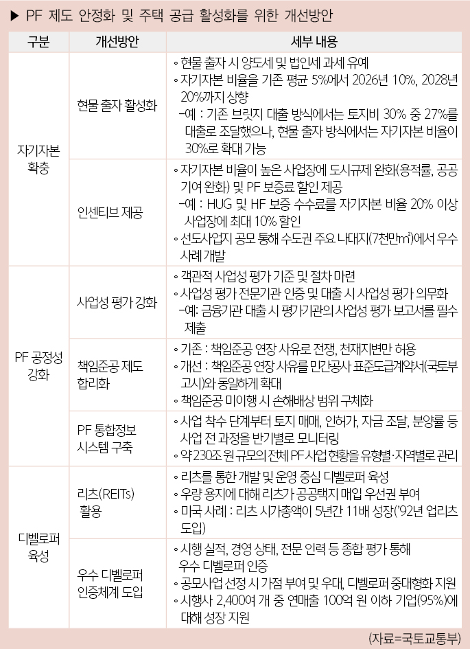 정부는 자기자본 확충, PF 시장 공정 질서 확립, 전문 디벨로퍼 육성을 중심으로 개선 방안을 제시했다.
