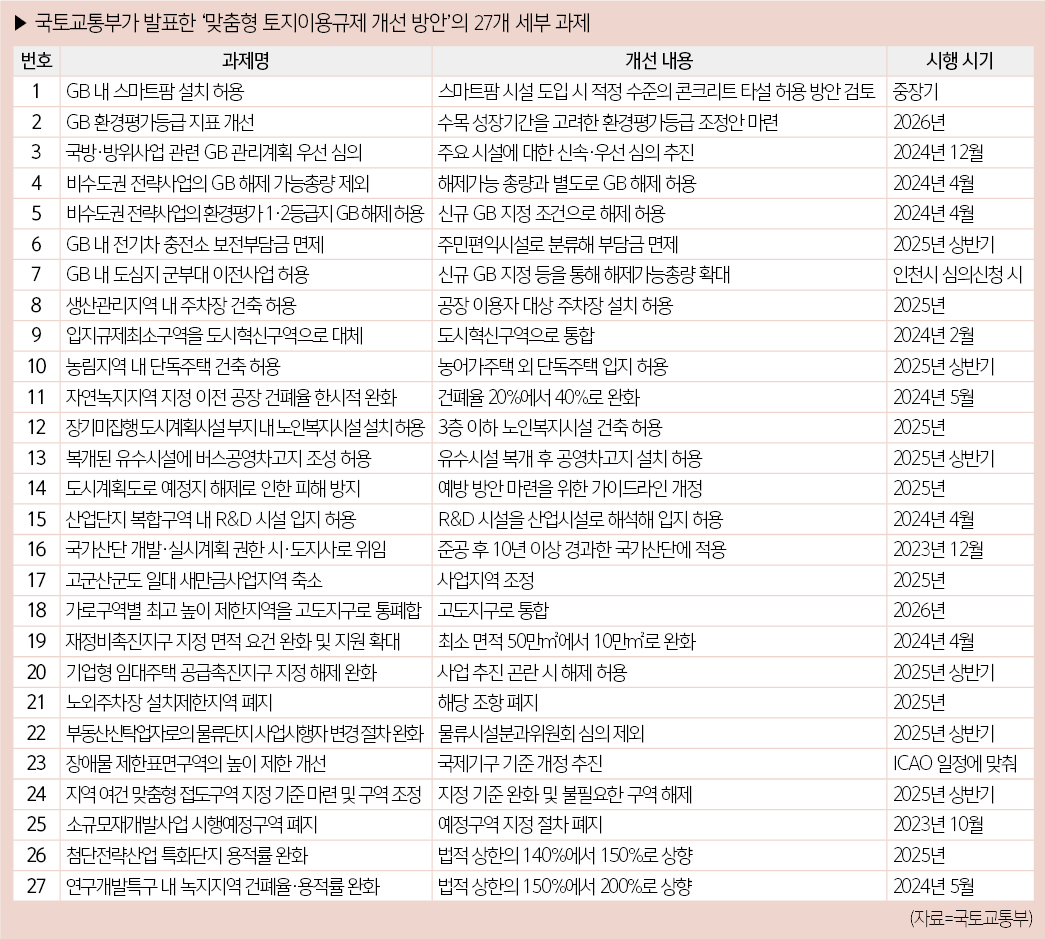 국토교통부는 11월 28일 대덕 연구개발특구에서 열린 ‘제7차 규제혁신전략회의’에서 지역경제와 첨단산업 활성화를 목표로 한 맞춤형 토지이용규제 개선 방안을 발표했다. 이번 개선안은 27개의 세부 과제를 담고 있으며, 지역 특성에 맞춘 규제 완화로 첨단산업 육성 및 지역경제 활성화를 목표로 한다.