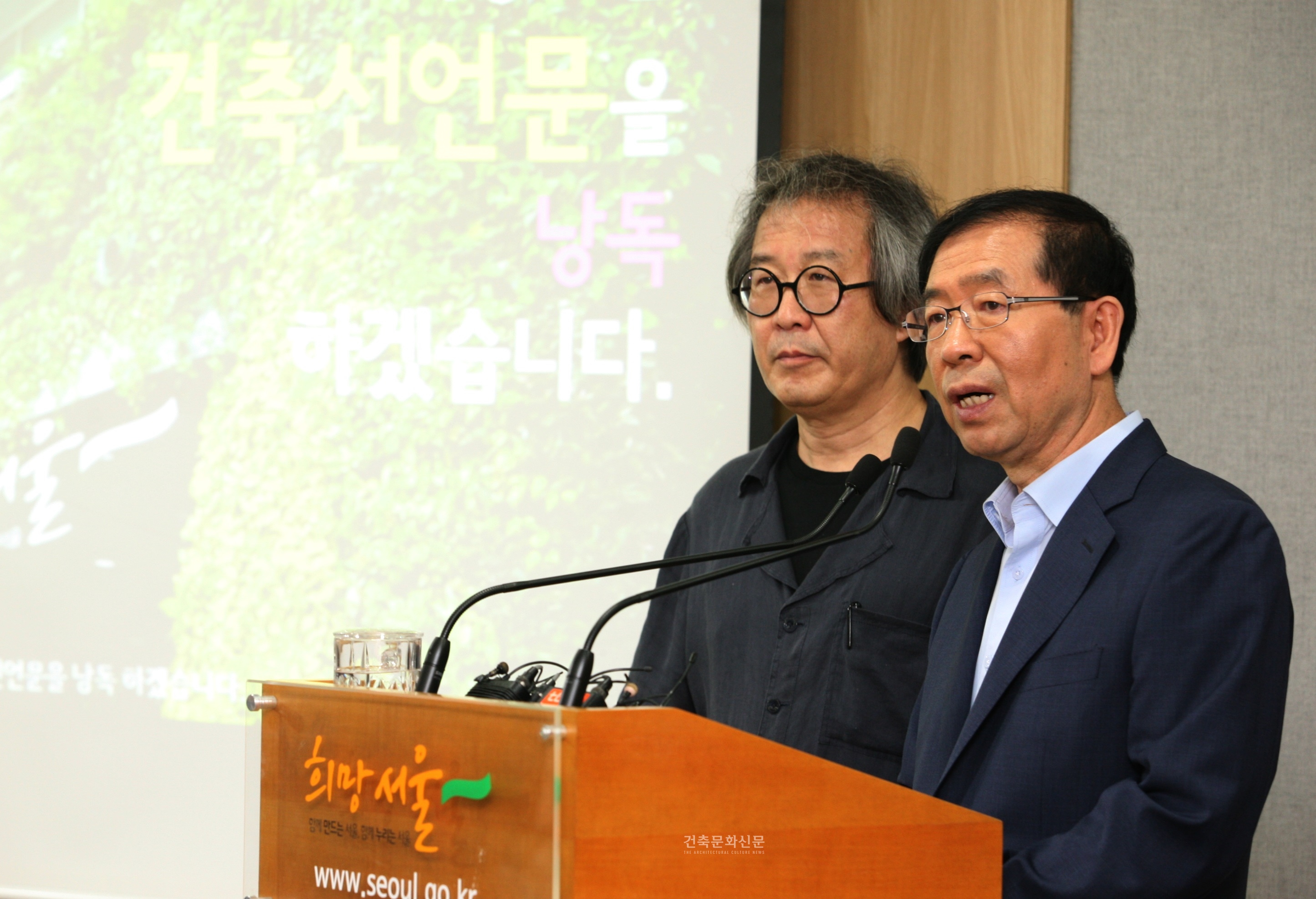 서울시는 지난 8월 20일 서울시 신청사에서 박원순 서울시장, 승효상 서울시 건축정책위원장을 비롯해 김영수 대한건축사협회 회장, 이광만 한국건축가협회 회장, 서치호 대한건축학회 회장 등 건축단체장이 참석한 가운데, ‘서울건축선언’을 선포했다.