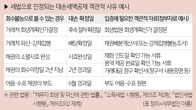그렇다면 2년이 지난 후라도 언제까지 공제가 가능한 걸까요? 사업자의 세 부담을 조금이라도 덜기 위해, 용역 산출물을 완료한 공급일로부터 10년 이내의 확정 신고 기한까지는 이후에 발생한 대손 상황에 대해서도 「소득세법 시행령」 제55조 제2항, 「법인세법 시행령」 제19조의2 제1항 또는 「채무자 회생법」에 따른 인가 결정 등의 객관적 대손 사유라면 공제가 가능합니다. 따라서 부가가치세 신고가 완료되고 장부에 대손금으로 반영한다면(인가 결정 등 신고 조정 사항 제외) 추후 경정 청구를 통해 환급받을 수 있습니다.