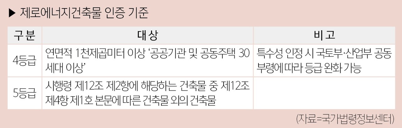 개정된 시행령에 따르면 연면적 1천제곱미터 이상 건축물 중 ‘공공기관 및 공동주택 30세대 이상’의 건축물을 건축 또는 리모델링하려는 경우 제로에너지건축물 4등급 인증을 받아야 한다. 다만 건축 목적이나 시공 여건상의 특수성으로 4등급 이상을 받기 불합리하다고 인정되는 경우 국토교통부와 산업통상자원부의 공동부령에 따라 완화된 등급을 적용할 수 있다.