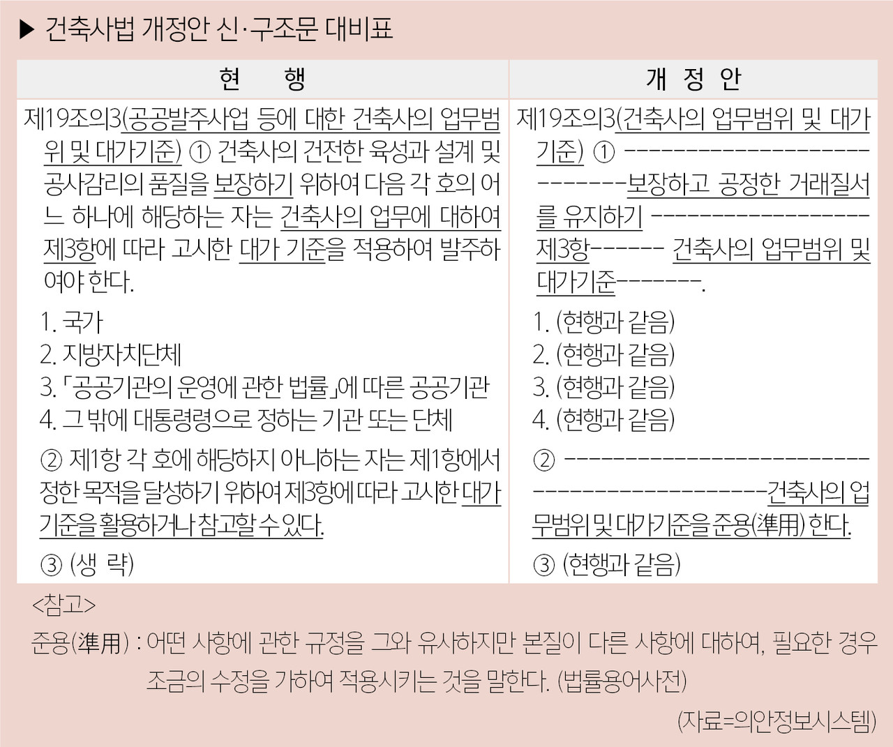 현행법은 건축사의 업무범위 및 대가기준을 공공 건축물에 대해서는 의무적으로 준수하도록 하고, 민간 건축물에는 이를 참고할 수 있도록 규정하고 있다. 그러나 이번 개정안은 민간 건축물에도 건축사의 업무범위 및 대가기준을 준용하도록 명시했다.
