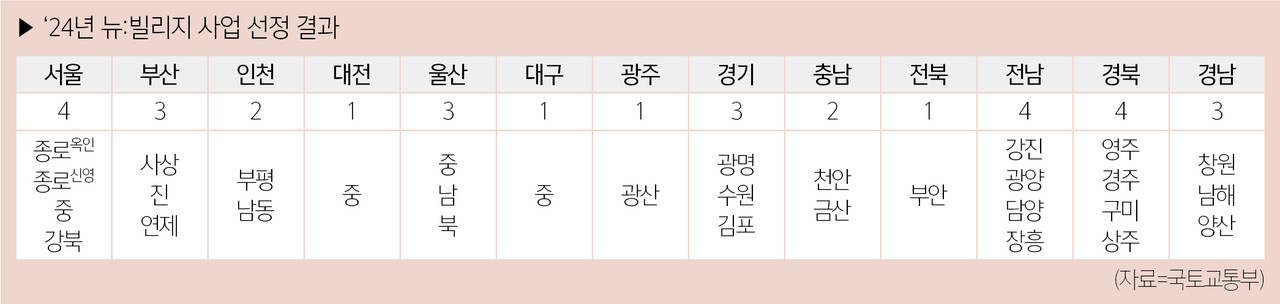 내년 1월 1일부터 국토교통부는 전국 32곳을 대상으로 뉴:빌리지 선도사업을 본격 추진한다. 이번 사업은 노후 단독주택과 다세대주택 밀집지역을 대상으로 주차장, 복합편의시설, 공원 등 기반시설 설치와 함께 주택정비 지원을 결합한 패키지 지원 사업이다.