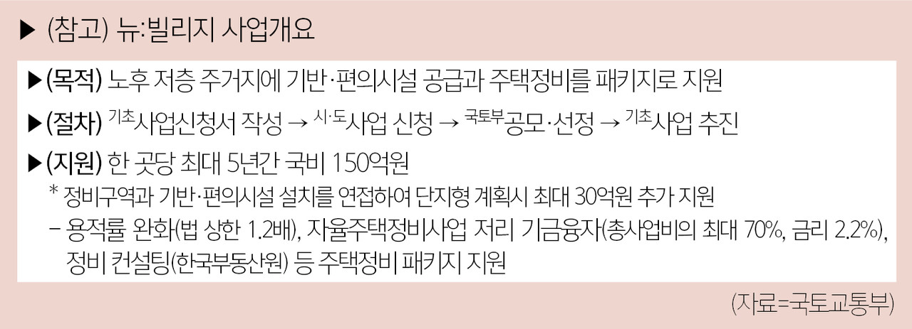 뉴:빌리지 사업은 전면 재개발·재건축이 어려운 지역에서 민간 주택 정비와 공공의 기반시설 지원을 연계해 정비를 지원하는 것이 핵심이다. 선정된 32개 지역에는 최대 5년간 국비 4,132억 원 포함, 총 1조 2천억 원이 투입되며, 237개 기반·편의시설이 설치될 예정이다.