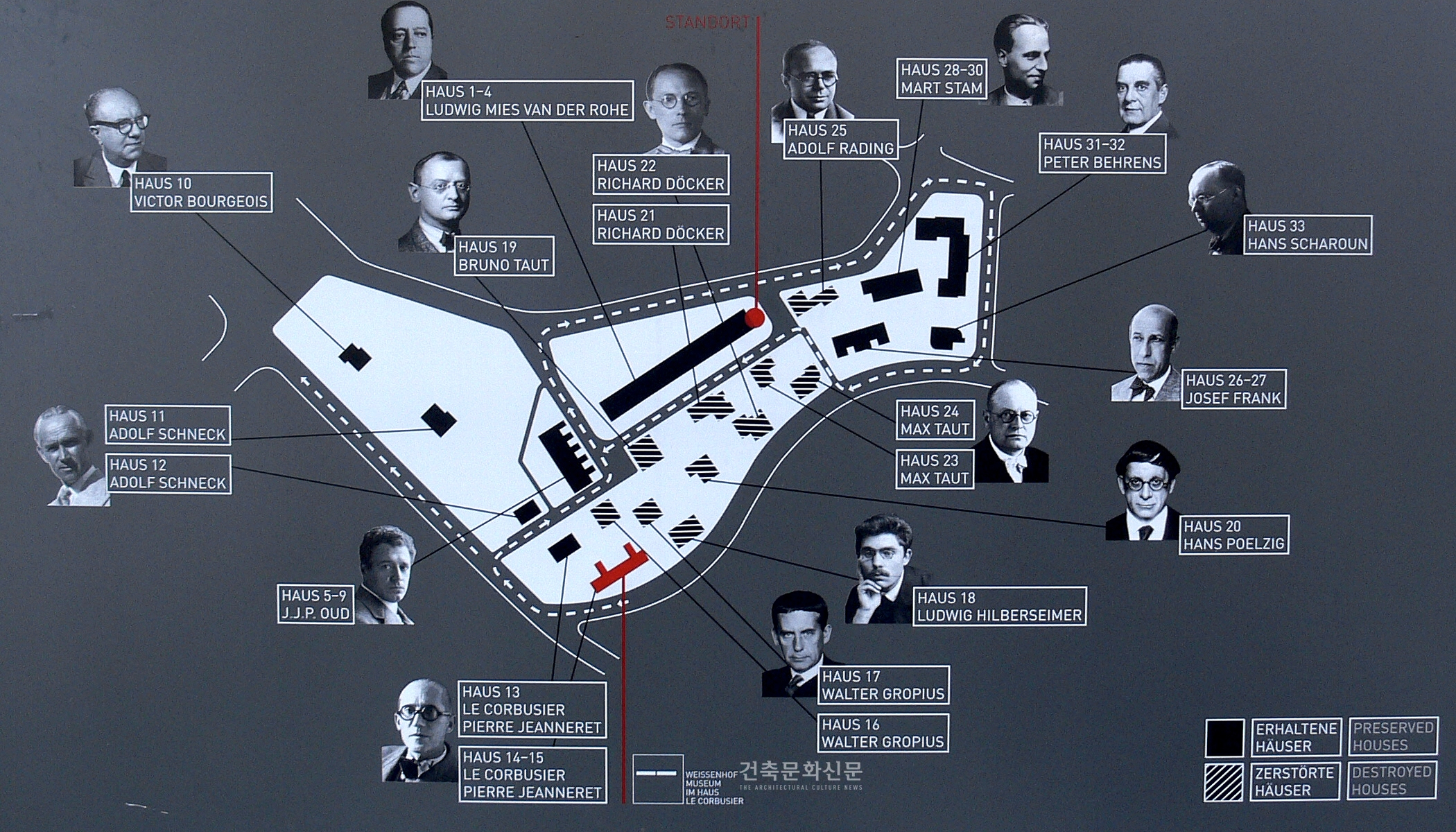 건축적 이견으로 시작해서 행정적인 문제까지 번져버렸지만 건축적 갈등이 부정적인 것만은 아니다. 네덜란드 근대건축운동인 데 스타일(De Stijl)과 벤딩헨파(Wendingen)의 경우에서도 보듯 새로운 건축을 추구한다는 지향점 아래 건축적 논쟁이 존재한다는 것은 달리 보면 담론의 풍부함을 의미한다. 풍부한 담론과 논쟁은 건강한 긴장감과 에너지를 발산해서 또 다른 담론의 생성을 유도한다. 비록 국제적 전람회를 표방했지만 참여건축사 16명 중 독어권 건축사가 14명(네덜란드 2명, 오스트리아 1명 포함)이었다.(그림 4) 따라서 이 행사는 표현주의라는 독어권의 예술이념아래 미스를 중심으로 순수를 표방한 이성주의자들과 헤링을 중심으로 유기적 태도를 지향한 기능주의자들이 앞에서 언급된 4 가지의 건축적 이슈들에 각각 다르게 반응한 결과들을 한 곳에 모아놓은 그야말로 아직 정치적 때가 묻지 않은 독일 근대건축담론의 장이었던 것이다.