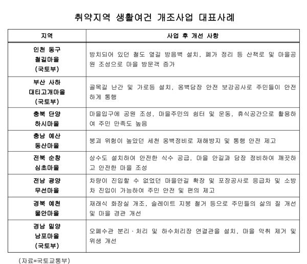 사업추진 관계자는 “거주지역에 상관없이 대한민국 온 국민이 최소한의 삶의 질을 보장받을 수 있도록 취약지역 생활여건 개조사업을 확대해 나가겠다”면서, “이번 사례집이 향후 동 사업에 참여하고자 하는 지역에서 사업을 준비하는데 큰 도움이 되기를 바란다”고 밝혔다.