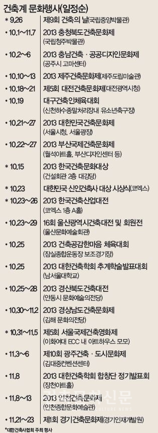 이밖에도 대한건축학회가 주최하는 ‘추계학술발표대회’가 10월 25일 9시 남서울대학교에서 열린다. 추계학술발표대회에서는 다양한 논문이 발표돼 건축계 발전에 이바지하고 있는데, 올 해도 수많은 논문들이 발표될 것으로 예상되고 있다. 아울러 한국건축가협회가 주최하는 ‘2013 대한민국건축문화제’는 11월 11일부터 17일까지 목동 대한민국예술인센터에서 열린다. 행사기간동안 열리는 부대행사로는 △제32회 대한민국건축대전 △2013 올해의 건축가100인 국제전 △제8회 대한민국공간문화대상 등이 있다.