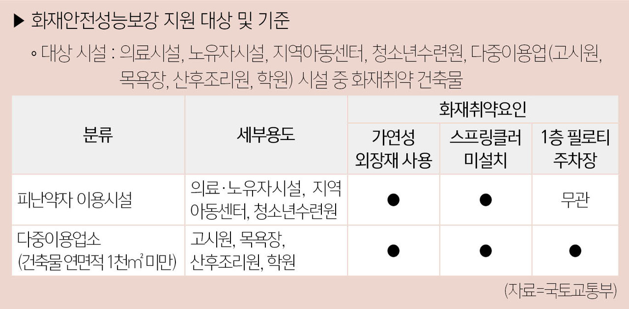 이번 사업은 화재에 취약한 건축물의 화재 안전 성능을 보강하는 것을 목표로 하며, 지원 대상은 의료시설, 노유자시설, 지역아동센터, 청소년수련원과 고시원, 목욕장, 산후조리원, 학원 등 일부 다중이용업소 중 화재 취약 건축물이다. 해당 건축물은 3층 이상이며, 가연성 외장재를 사용하고 스프링클러가 설치되지 않은 경우에 해당한다. 다중이용업소의 경우 1층 필로티 주차장을 갖춘 연면적 1,000㎡ 미만 건축물만 지원받을 수 있다.