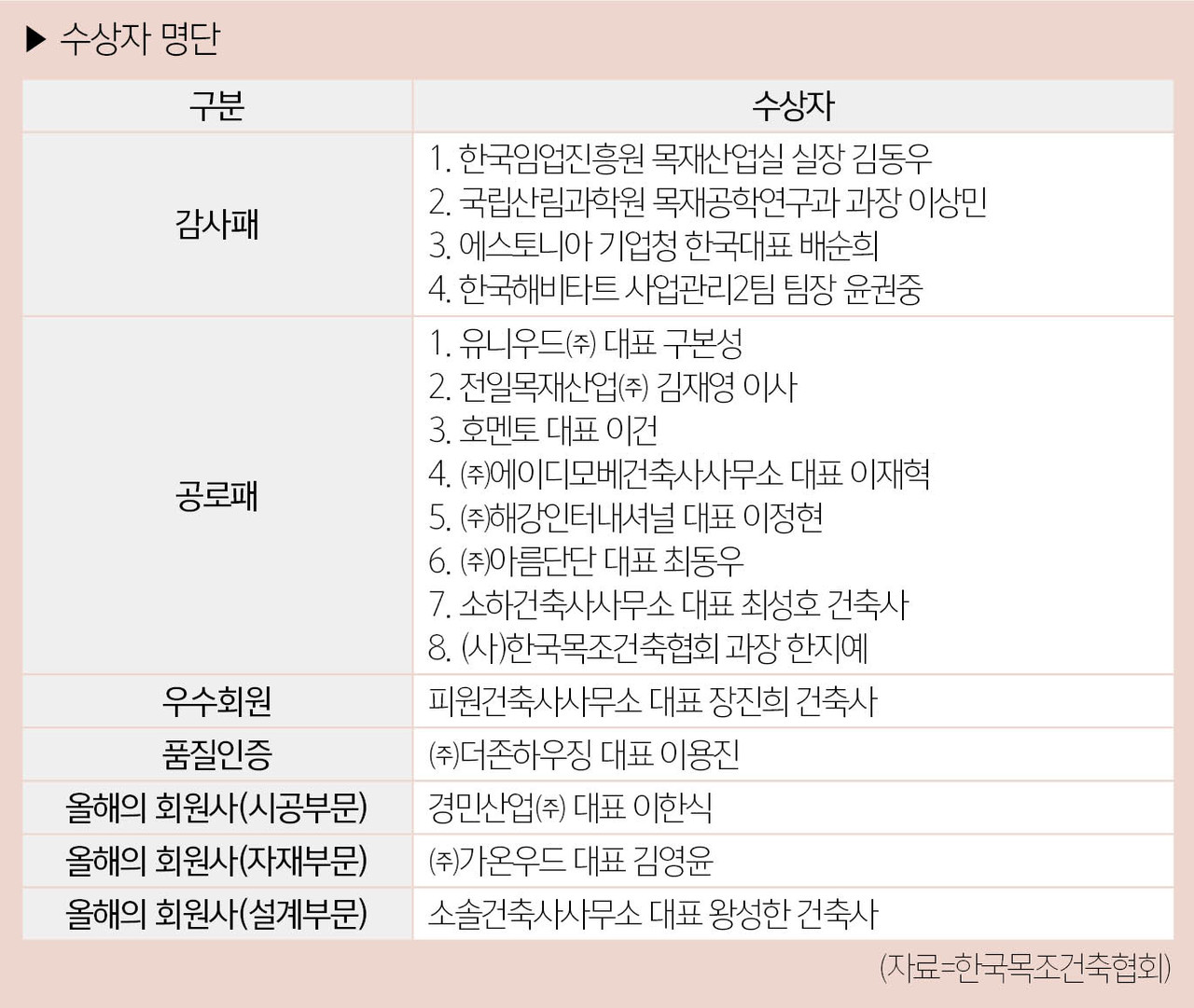 시상식에서는 올해의 회원사상, 5-STAR 품질인증상, 우수회원상, 공로패, 감사패 등이 수여됐다. 올해의 회원사상은 협회의 위상을 높이고 활발한 활동을 펼친 기업에 수여되며, 시공 부문 경민산업(주) 이한식 대표, 자재 부문 (주)가온우드 김영윤 대표, 설계 부문 소솔건축사사무소 왕성한 대표가 선정됐다.