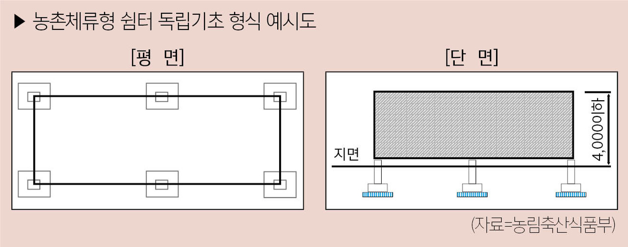 또 쉼터는 1층으로만 설치할 수 있으며, 높이는 최대 4미터까지 허용된다. 다락의 경우 일반적으로 1.5미터까지 가능하지만, 경사지붕을 적용하면 1.8미터까지 확장할 수 있다. 또한, 건축법 시행령에 따라 데크, 처마, 정화조는 쉼터의 연면적 33제곱미터 이내와 별도로 추가 설치할 수 있다. 특히, 소방활동이 원활히 이뤄질 수 있도록 도로와 인접한 농지에만 설치가 가능하며, 주민들이 통상적으로 이용하는 비공식적인 통로도 이에 포함된다.