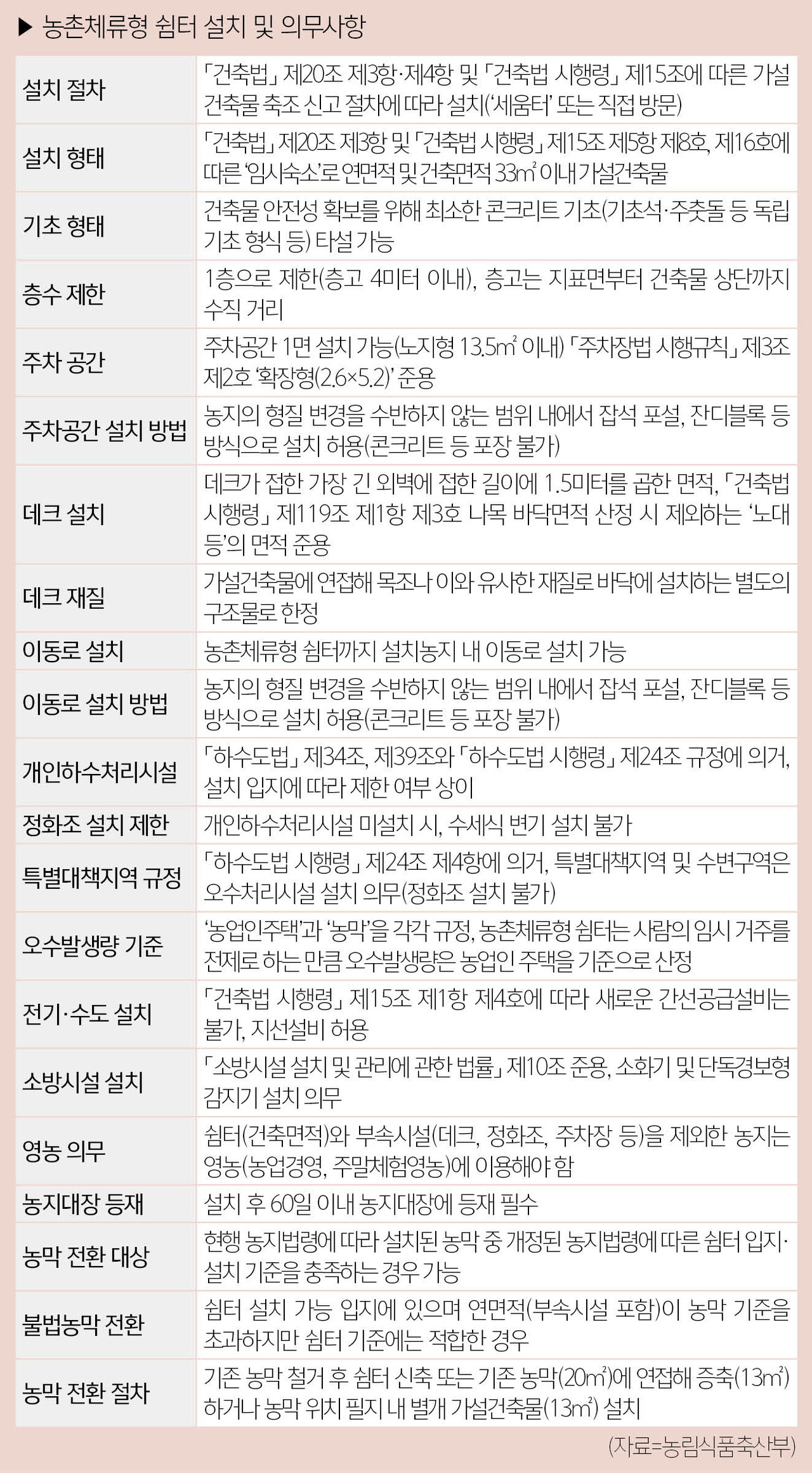 농촌체류형 쉼터는 주말 체험영농을 원하는 사람과 농업경영에 필요한 경우 농업인, 임차농도 설치할 수 있다. 특히 농업인은 농업법인을 제외하고 농업진흥지역 여부와 관계없이 모든 농지에 설치할 수 있다.