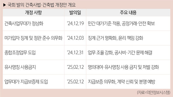 건축사업계의 산업 경쟁력 강화와 신뢰도 향상을 위해 국회에 건축사법과 건축법 개정안이 대거 발의됐다. 이번 개정안은 ▲건축사의 업무 정상화 ▲윤리 의식 제고 ▲종합조정 업무 도입 ▲유사명칭 사용 제한 ▲업무대가 지급보증제 도입을 주요 내용으로 담고 있다. 본지는 건축사 업무와 직결된 법안의 취지와 내용을 상세히 전한다.