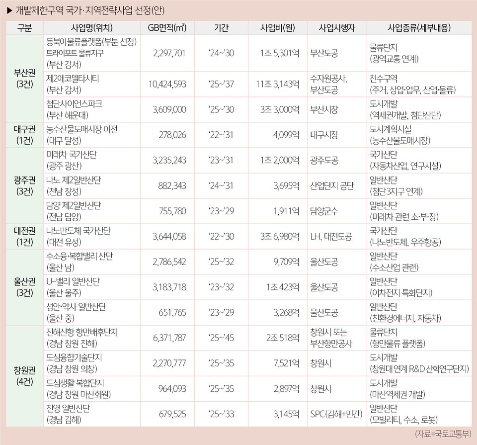 선정된 15곳의 사업 중 지역 특화산업을 집적·육성함에 따라 균형발전 효과가 클 것으로 예상되는 산업·물류단지 조성 사업이 총 10곳으로 가장 많이 선정됐다. 이외에도 균형발전 관점에서 지역에 필요했던 사업이지만 환경평가 1·2등급지 비율이 높거나, 지차제 개발제한구역 해체 총량이 부족해 자체적으로 추진하기 어려웠던 사업도 총 5곳이 선정됐다.