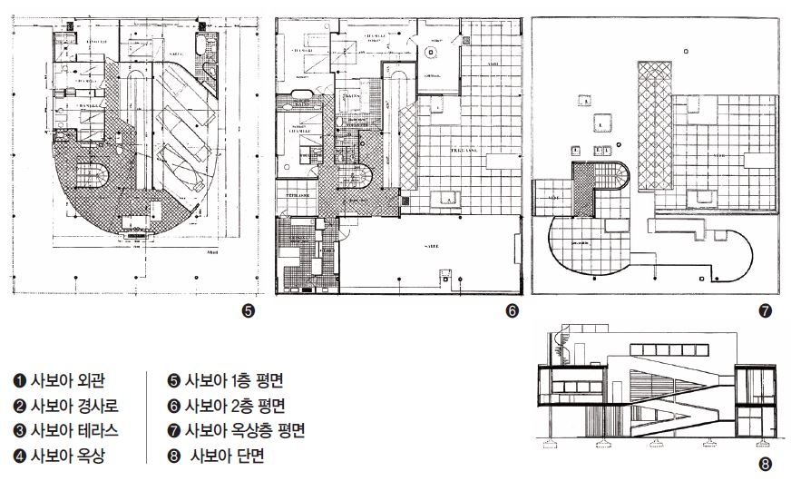 파리 북서쪽으로 약 30km정도 떨어진 포아시(Poissy) 근교에 위치한 이 저택은 사보아 가족을 위한 주말 별장으로 계획됐다. 필로티 위에 세워진 백색의 박스형 볼륨은 정사각형에 가까운 평면을 가지며, 한 변의 길이는 20m에 근접한다. 이러한 건물의 규모를 생각하면 ‘저택’이라는 말 자체가 전혀 무색하지 않겠다. 1층은 필로티 안쪽으로 후퇴된 벽면으로 U자형의 평면을 이루며, 그 중심축을 기준으로 대부분의 기둥이 대칭으로 자리해 규칙적인 리듬을 보인다. 원호 끝 중심축 상에 위치한 출입구에 들어서면 같은 축 위에 놓인 경사로를 대면하게 되는데, 1층의 중앙을 호령하는 이 ‘건축적 산책로(promenade architecturale)’는 2층을 거쳐 옥상 최상위 레벨까지 이어진다. 이와는 별개로 서비스 동선을 담당하는 계단실이 경사로 옆에 배치돼 각 층의 부속공간을 매개한다. 주층(piano nobile)인 2층에는 커다란 살롱(salon)이 북서쪽에 놓여 전면을 가로지르는 수평창을 통해 푸른 초장을 조망하며, 평면 반대편은 침실 등 여러 사적공간이 점하고 있다. 그리고 그 사이의 한편이 큼직한 테라스에 할애돼 실내외를 중재하는데, 여기서 곧바로 경사로를 통해 최상층의 옥상 정원에 이를 수 있다.