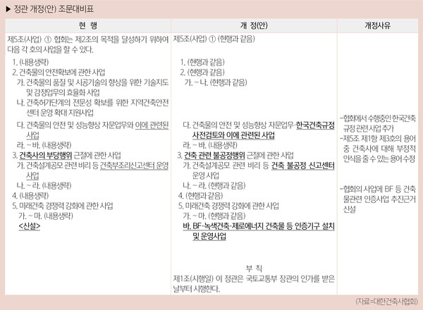 이번 개정은 2월 26일 열린 제59회 정기총회 부의 안건인 정관 개정(안) 승인에 따른 것으로, ▲한국건축규정 사전 검토 및 관련 사업 추가 ▲BF·녹색건축·제로에너지 건축물 인증사업 추진 기구 설치 및 사업 근거 마련 등이 가능해졌다.