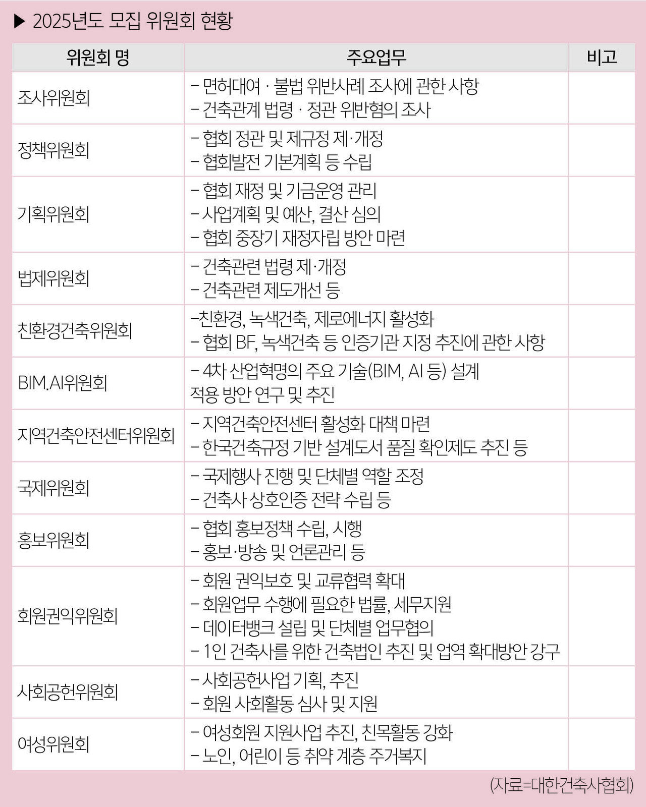 대한건축사협회가 2025년도 협회 위원회 위원을 모집한다. 협회는 정관 제31조에 따라 운영되는 20개 위원회에서, 운영·사업·예산 등에 대한 회장의 자문 및 제안을 담당할 위원을 모집할 계획이다.