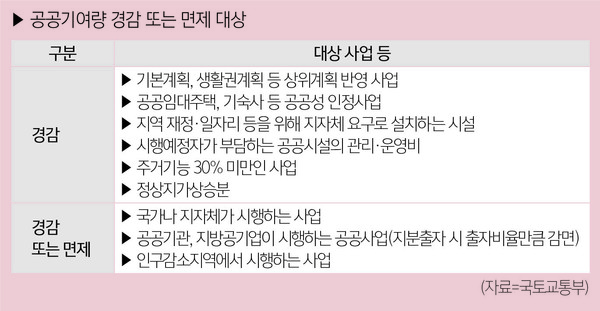 감면 기준도 있다. 일자리·재정 창출 등 공공목적 실현 사업 ▲사업자가 부담하는 공공시설 등의 관리·운영비 ▲저수익·비주거 기능중심 개발 ▲계획 변경과 무관한 지가변동 등 다양한 경우에 대해 공공기여량을 경감할 수 있도록 하였다. 이를테면 인구감소지역에서 시행하는 사업, 공기업 등 공공시행 사업은 경감 또는 면제할 수 있도록 했다.