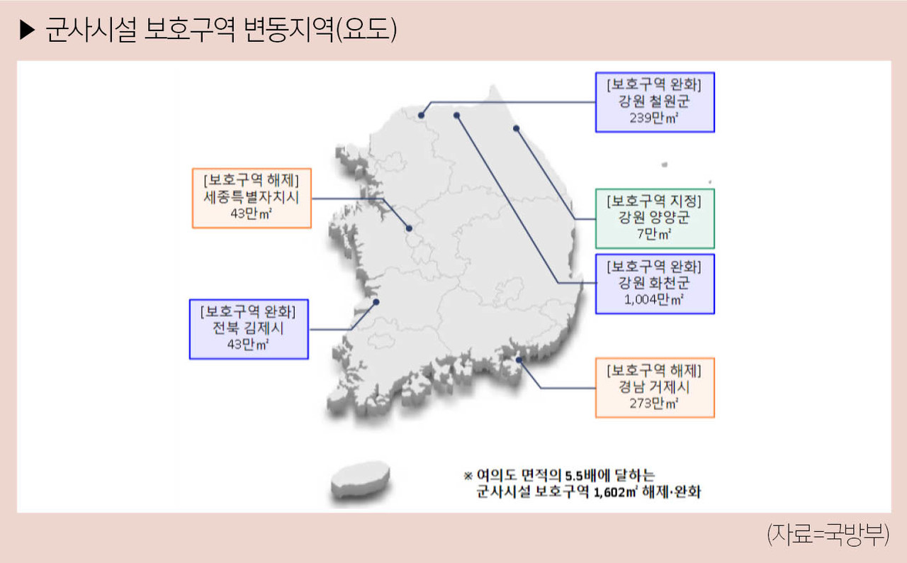 국방부는 3월 26일, 지역 활성화와 국민 권익 증진을 위해 약 1,602만㎡의 군사시설 보호구역을 해제하거나 완화한다고 발표했다. 이는 여의도 면적의 5.5배에 해당하는 규모다.