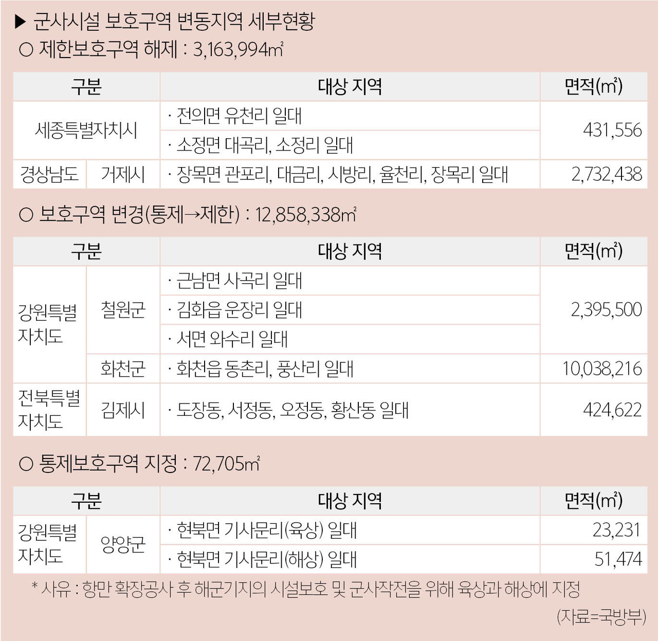 한편, 강원특별자치도 양양군의 7만㎡는 군사작전상 필요성에 따라 지자체 및 주민과의 협의를 거쳐 통제보호구역으로 신규 지정됐다.