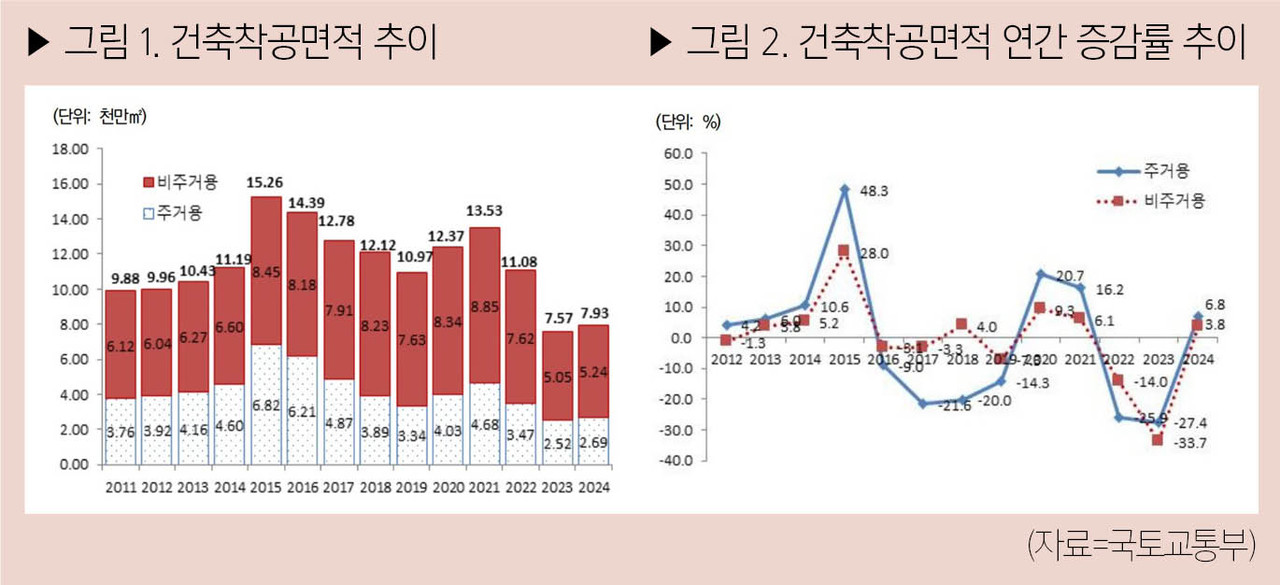 작년 주거용 건축착공면적이 2022~2023년 감소한 이후 3년 만에 다시 증가한 것으로 나타났다. 하지만 전년 대비 증가한 수치임에도 예년의 70~80% 수준에 불과한 것으로 분석됐다.