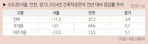 수도권의 주거용 건축착공면적은 1,170만 제곱미터를 기록했는데, 서울이 3.5% 감소한 것에 비해, 경기도와 인천이 각각 전년 대비 5.1%, 13.5% 증가해 수도권 주거용 건축착공면적이 상승한 것으로 분석됐다.