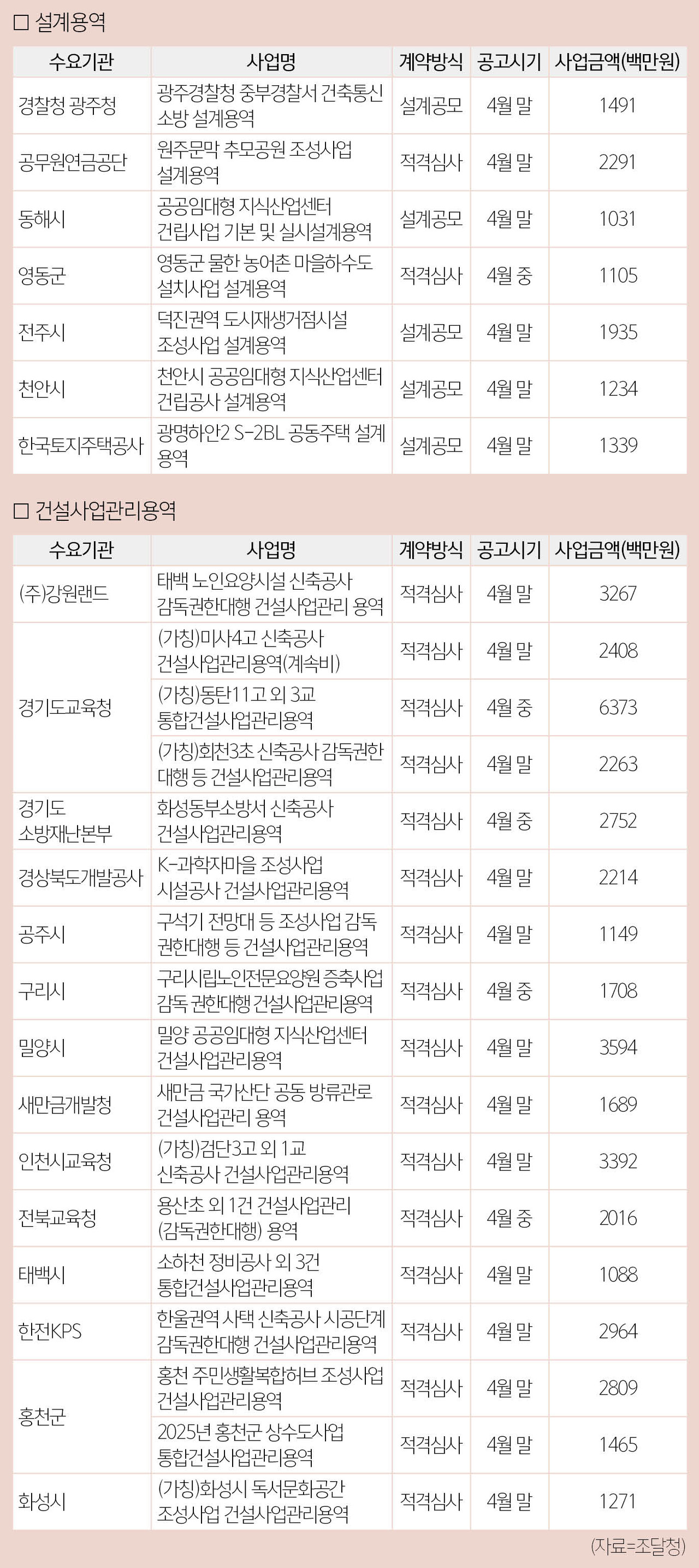 조달청은 3월 31일, 4월 중 설계용역과 건설사업관리용역 24건, 총 504억 원 규모의 대형사업을 경쟁입찰 방식으로 공고할 예정이라고 밝혔다. 이 가운데 설계공모 방식은 5건이다.